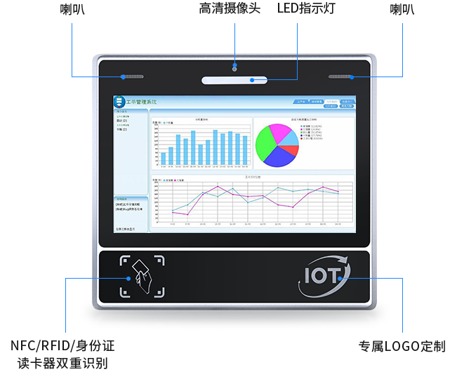 10.1寸安卓工位一體機是產線管理專屬設備,整機采用鋁合金一體打造,金屬拉絲工藝,純平面板設計,防水防塵,支持NFC讀卡識別,可升級IC卡識別、二維碼、掃描槍、HDMI輸入模塊等,滿足識別和拓展需要,搭載MES制造管理系統,在智能產線中實現任務瀏覽、設備管理、缺陷登記、異常警報等功能。